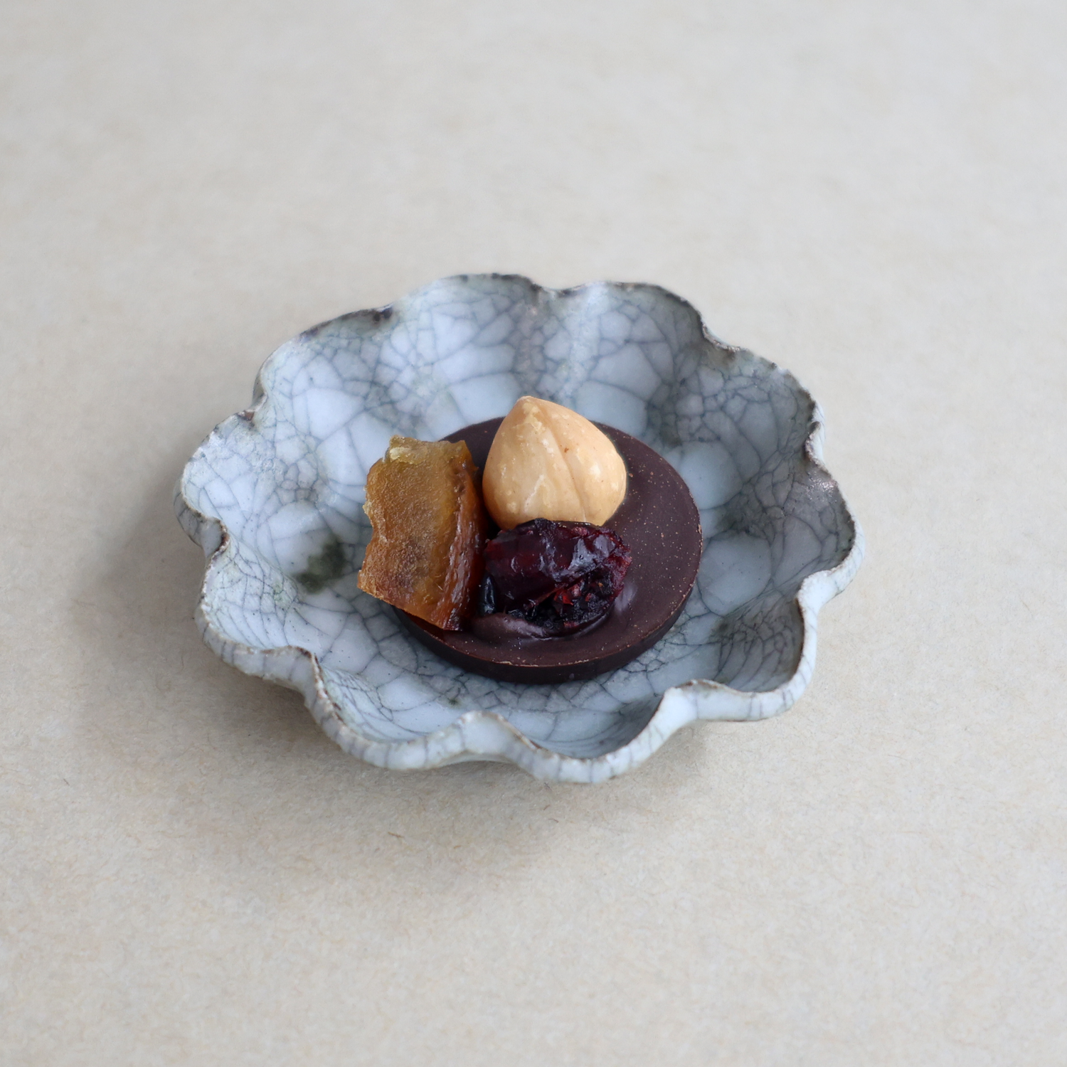【マンディアンノワール】 62%のダークチョコレートに、ネーブル、チェリー、ヘーゼルナッツ。ほろ苦い大人の組み合わせ