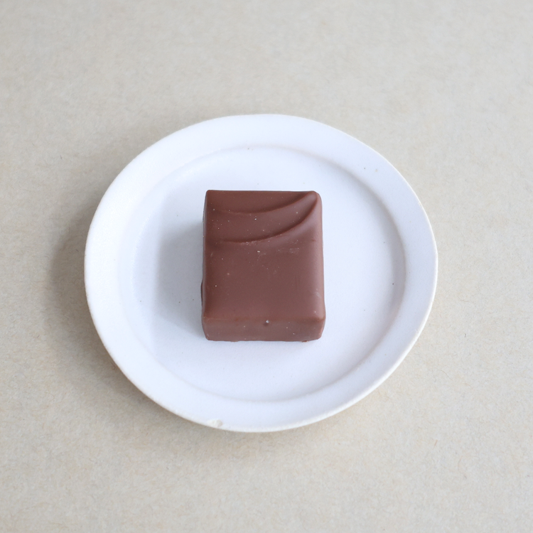 【ジャンドゥーヤミルク】 ヘーゼルナッツペーストとアーモンドにキャラメルを合わせてガナッシュでコーティング。濃厚でなめらかなミルクジャンドゥーヤです