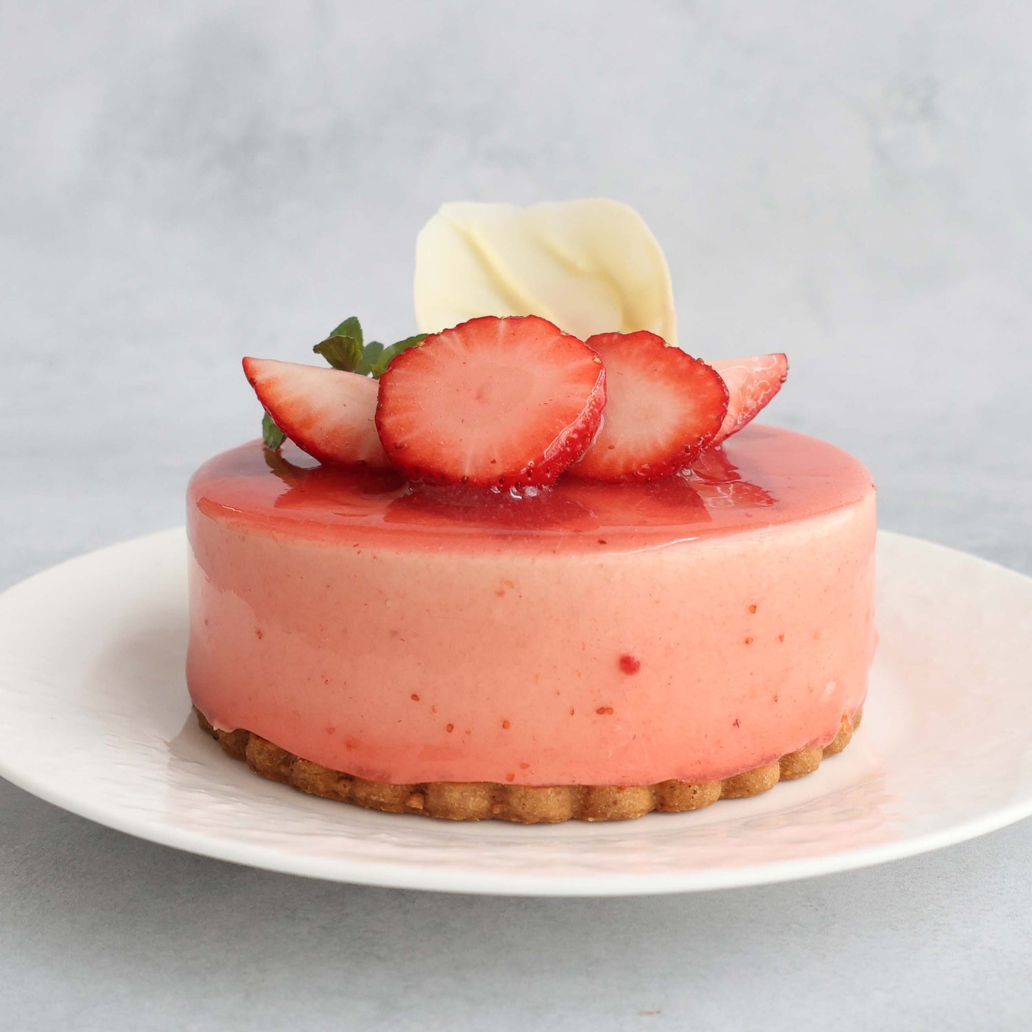 ホワイトチョコレートのムースは、ミルキーでやさしい味わい。配合を緻密に調整することで甘すぎず、苺ジュレとの相性がより引き立つバランスに仕上げています。