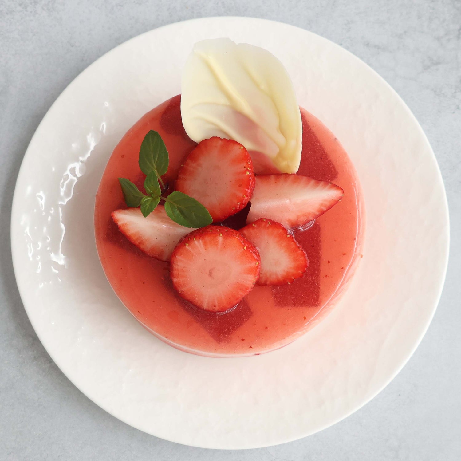 苺そのものを食べているような味わいの苺ジュレは、ゼラチンや卵で固めず、独自の製法で“ジュレとソースの中間”のやわらかな食感に仕上げました。すっと溶けていくため、苺の香りがふわりと広がります。