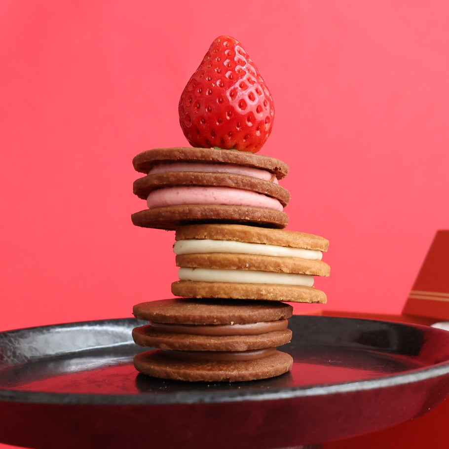 甘酸っぱいあまおうのクリームをココアパウダーを合せたサクサクのサブレ生地でサンド。ショコラ風味の生地は甘さ控えめで、キュンと甘酸っぱいクリームのおいしさが引き立ちます。