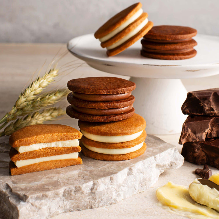 サンドしているクリームは、ホワイトチョコレートと、チョコレートにそれぞれ北海道産バターを合せ、クリームチーズパウダーを加え、まろやかで風味豊かな味わいに仕上げました。