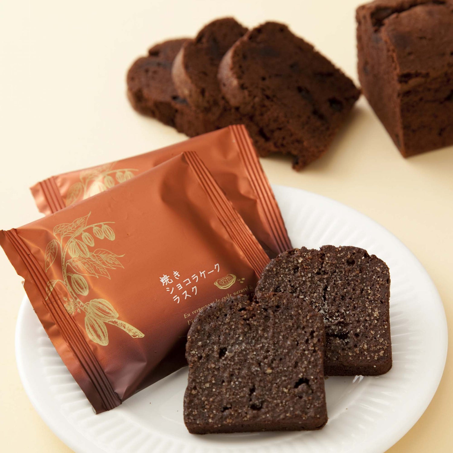 ラ・テール洋菓子店が開店以来おつくりしている人気のケーキ「ガトーショコラ」をヒントに、ラ・テールならではのラスクをおつくりしました。 小麦粉に対して2.5倍のチョコレートを混ぜ合わせた生地には、チョコチップも加えて、チョコレートのおいしさを贅沢に表現。パウンド型の中で焼き上げたケーキを1回目の乾燥をしてからスライスして、クーベルチュールチョコレートと北海道産の発酵バターをひと塗り。さらにオーガニックシュガーと沖縄産の塩を振って味を引き締めています。 最後に再び乾燥焼きをして、おいしさを凝縮させました。時間と手間をかけておつくりしたおいしさです。