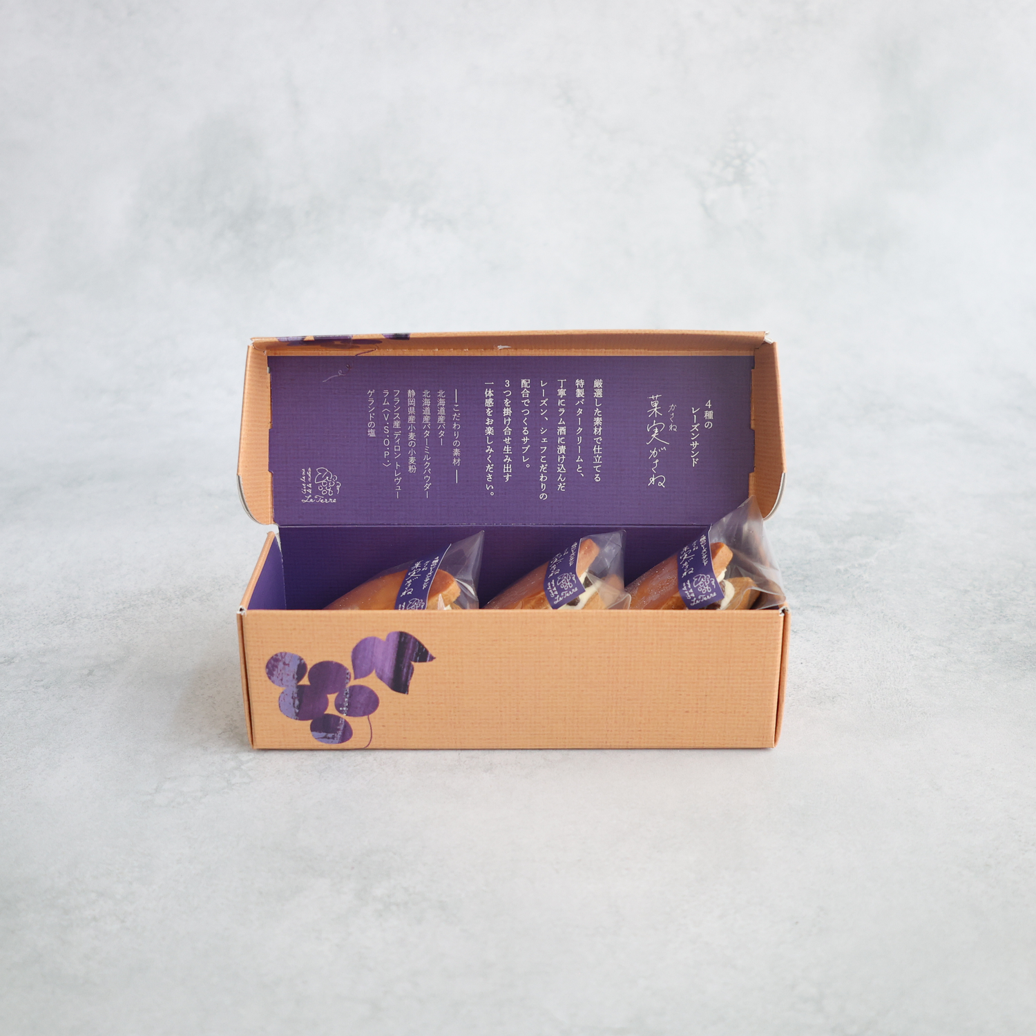 厳選した北海道産バターで仕立てる特製バタークリームと、丁寧にラム酒に漬け込んだ4種のレーズン、シェフこだわりの配合でつくるサブレ。
