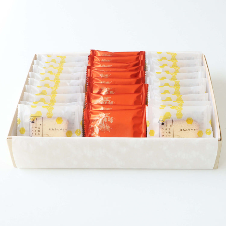 パウンドケーキをそのままラスクに仕立てました。軽くて持ち運びやすくて大容量でお日持ちも◎国産はちみつとオーガニックシュガー、バターのやさしい「はちみつバターカステラ」と、チョコレートとチョコチップたっぷり、贅沢な「焼きショコラケーク」のアソートです。